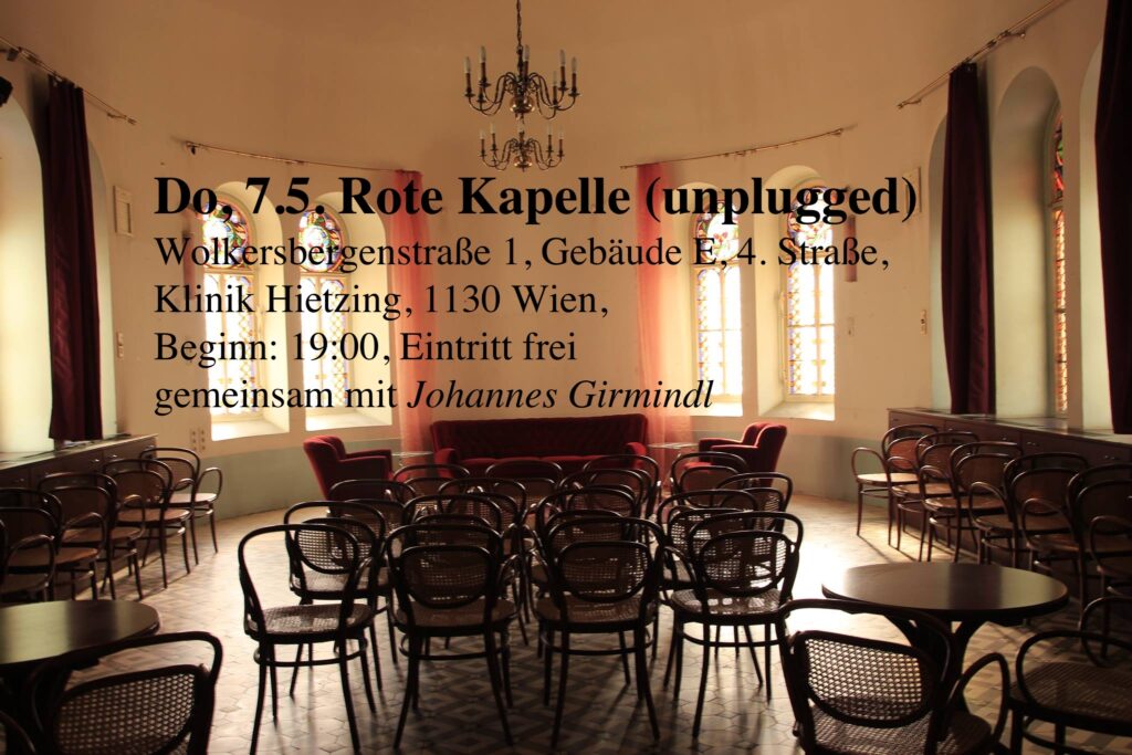Di 30.04.2024 Rote Kapelle, Klinik Hietzing, Gebäude E, 1030 Wien, zu Beginn gibt es eine musikalische Lesung anlässlich der Buch-Veröffentlichung „Salon Helga“ von Eva Billisich. Musikalisch unterstützt von Werner Rabl.
